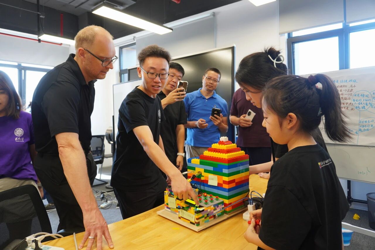 7月13日下午,欧美同学基金会秘书长梁文美女士、乐高教育全球教育影响力负责人Bo Stjerne Thomsen博士、以及清华大学终身学习实验室的评委组出席了成果汇报会。各组同学分别介绍了本组作品所聚焦的问题、设计思路、原型制作过程、以及在学习中的心得体会。