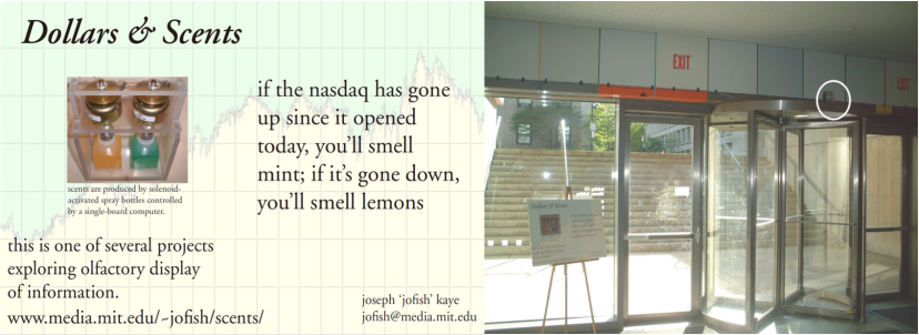 一个著名的艺术实验是 MIT Media Lab 的 “Dollars & Scents”。部署在实验室办公楼大堂的扩香系统会根据股市变化自动释放不同气味:市场上涨时喷出清新的薄荷味,让人心情愉快;下跌时则散发酸涩的柠檬味,引发焦虑与警觉。这不仅是一个有趣的技术展示,更提示了人们气味可以传递信息与情绪的妙用。