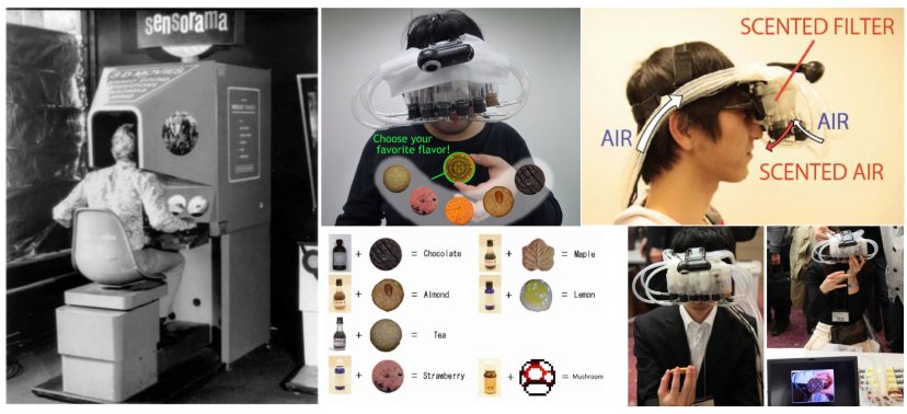 从上世纪初开始,不断有发明家、从业者尝试在影院释放气味,使得观众更加“身临其境”,虽然效果不佳,但这些尝试开创了“气味电影”的先河。此后,研究者不断探索设计嗅觉增强的多感官体验,如Sensorama(1960s):视觉影像系统结合风、振动和气味;MetaCookie+(2011, CHI)[5]:通过视觉增强和气味叠加,让普通饼干“变身”不同口味。
