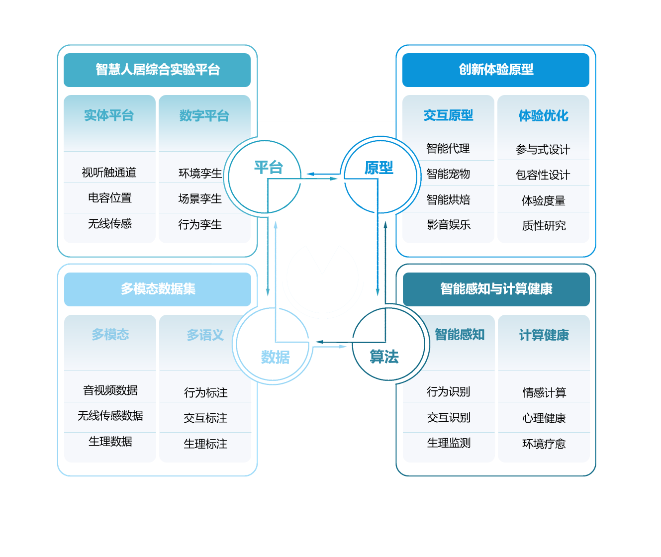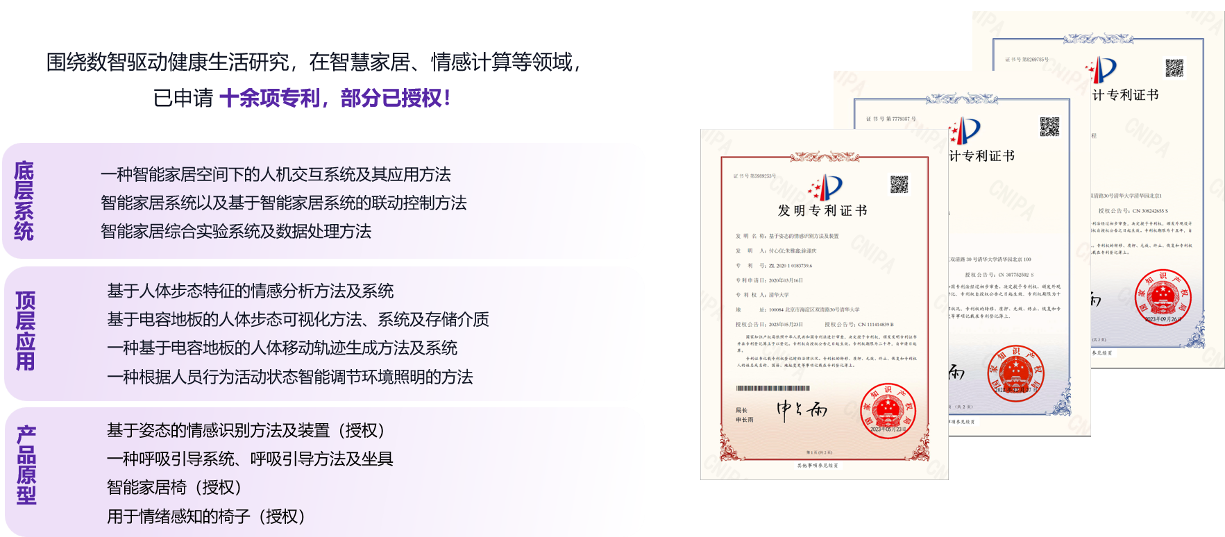 平台层面:搭建了全球领先的实体/数字智慧家居综合实验平台,涵盖12+传感器网络,1PB存储能力和高速计算能力,可支撑数据采集、智能感知、计算健康、多模交互等研究,已获发明专利授权6项;
