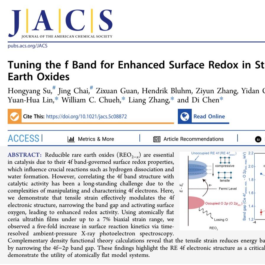 近日,清华大学未来实验室、燃烧能源中心、车辆与运载学院、材料学院,上海科技大学,美国斯坦福大学、伯克利国家实验室先进光源和德国马普所等跨学科团队,在稀土氧化物催化材料的电子结构调控与表面反应动力学研究中取得进展。研究成果以《Tuning f band for Enhanced Surface Redox in Strained Rare Earth Oxides》为题,发表于化学领域TOP期刊《Journal of the American Chemical Society》。